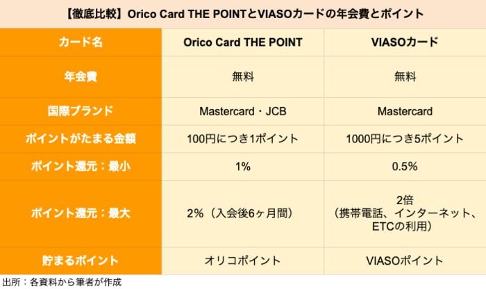 それでは早速、Orico Card THE POINTとVIASOカードを比較していきましょう。まずは比較表をご覧ください。