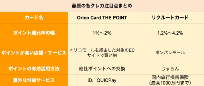 このように、Orico Card THE POINTはポイントの汎用性や貯めやすさが、リクルートカードは1.2%の還元率が喜ばれていることがわかります。