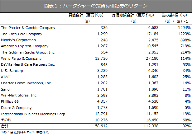 まず、図表1を見てください。これは、バークシャーの2015年アニュアルレポートに記載されている投資有価証券の主要銘柄の買値合計額と、その保有分に関する時価総額の合計です。