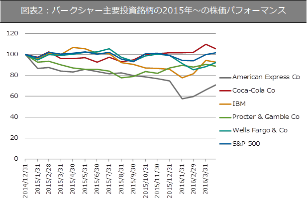 バフェットに見つかったら怒られそうですが、バークシャーの主要投資銘柄のうち上位5社と、S&P500の2015年の株価推移を比較してみました(図表2参照)。ここでは、2014年12月末時点の株価を100とし、2016年4月22日までの株価パフォーマンスを見ています。