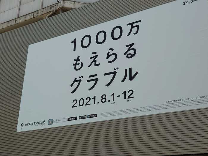 きっかけになったのは、JR秋葉原駅は電気街改札付近にある屋外広告。壁面に貼られた巨大なOOH広告には、「1000万 もえらる グラブル」の文字が。これ、筆者の誤字じゃありませんよ。写真をよくご覧ください。「もらえる」ではなく「もえらる」になってます…。