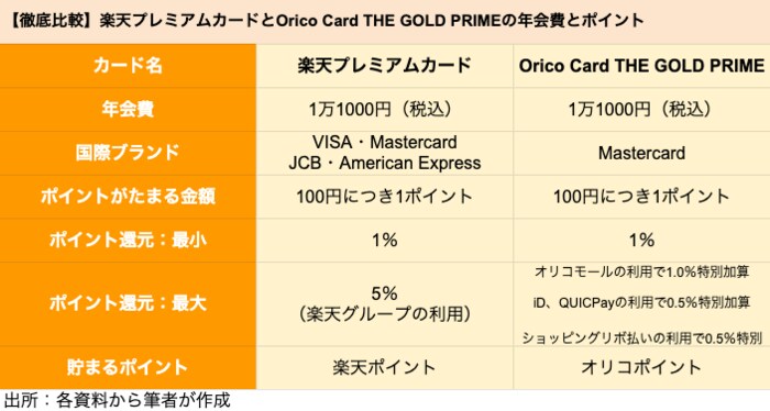 それでは早速、楽天プレミアムカードとOrico Card THE GOLD PRIMEを比較していきましょう。まずは比較表をご覧ください。