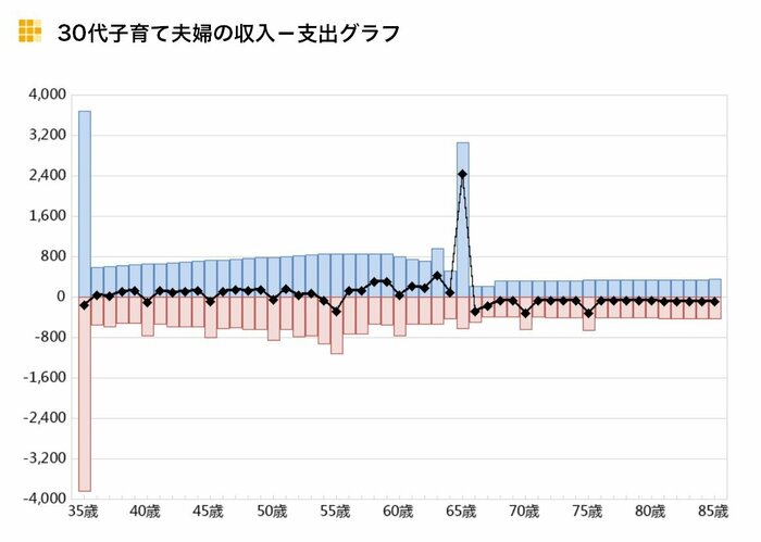 <30代子育て夫婦の収入-支出グラフ>をごらんください。