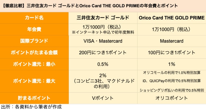 【徹底比較】三井住友カード ゴールドとOrico Card THE GOLD PRIMEの年会費とポイント