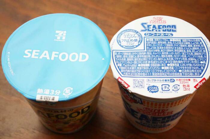 前回のポテトチップス比較に続いて、今回は、1971年から続くカップ麺のパイオニア・日清食品の『カップヌードル シーフードヌードル』と、国内2万1208店舗((2021年7月末時点)を擁するコンビニエンスストアのトップブランド・セブンイレブンのPB『たっぷり具材のSEAFOOD Seafood Noodles』を比べていきます。これ、売り場で迷ったことがある人、多いんじゃないでしょうか。