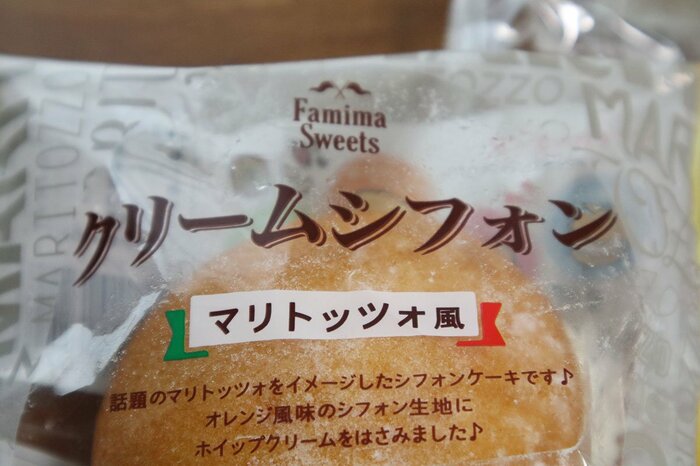 一方の、ファミリーマート版は、あくまで「シフォンケーキ」。シフォンケーキとはスポンジケーキのことですから、これは一言でいえば生クリームを甘いスポンジケーキで挟んだものということになります。原材料にもパンではなく「ミックス粉」の記載がありました。