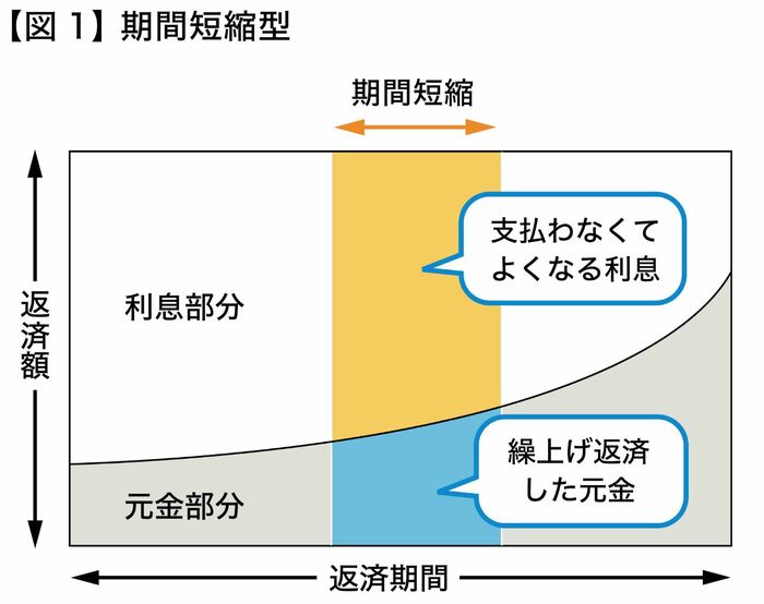 繰上げ返済には、返済額を変えずに返済期間を短くする「期間短縮型(図1)」と返済期間はそのままに返済額を減額する「返済額軽減型(図2)」があります。