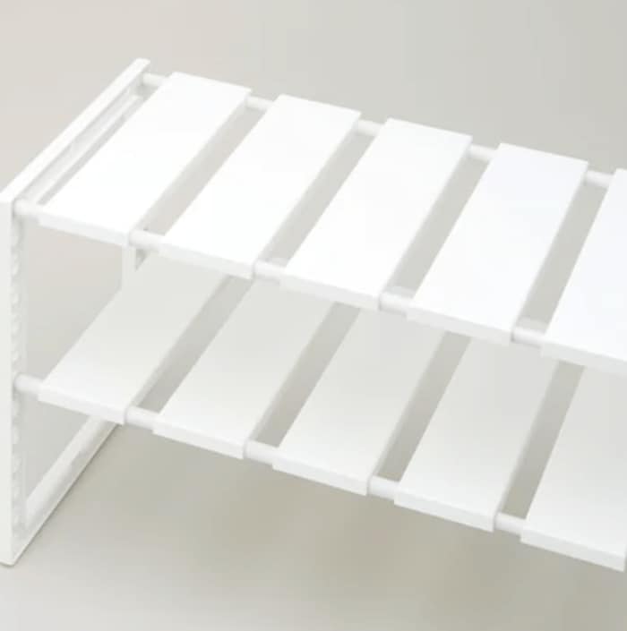 スライド式なので奥のものも取り出しやすい、2段タイプのラックです。組み立て時間約5分と、簡単につくれるのも高ポイント。下段は底面から上段下まで約30cmあるため、高さのある調味料などを立てて収納することができます。