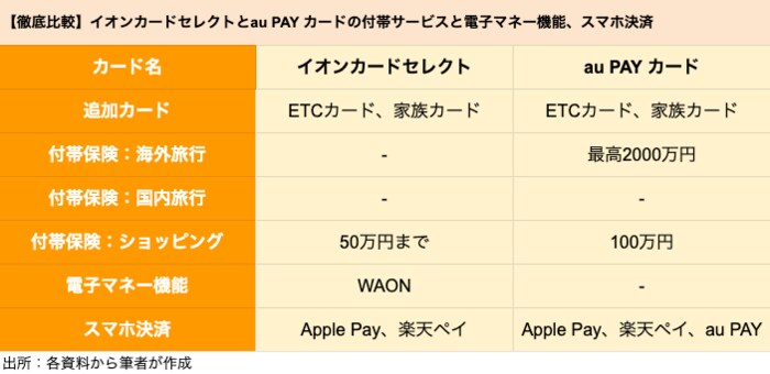 【徹底比較】イオンカードセレクトとau PAY カードの付帯サービスと電子マネー機能、スマホ決済
