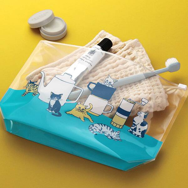 ネコたちがコーヒータイムを楽しむイラストの描かれたジッパーバッグです。