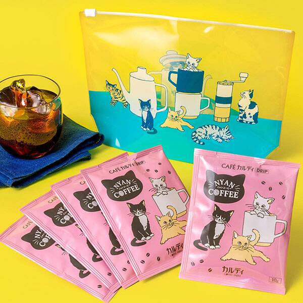 毎年大人気のニャンコーヒードリップセット。今年も新デザインで登場しました。今回も「カフェカルディドリップ ニャンコーヒー」5袋が入った、にゃんこ柄がかわいいジッパーバッグ入りセットになっています。