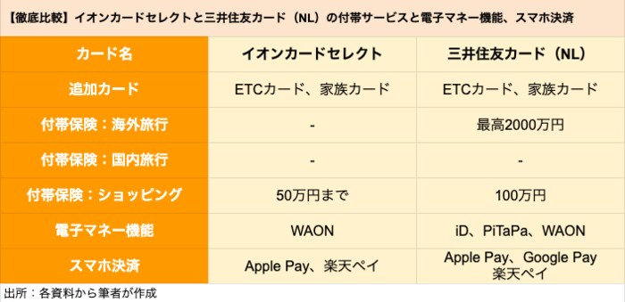 【徹底比較】イオンカードセレクトと三井住友カード(NL)の付帯サービスと電子マネー機能、スマホ決済