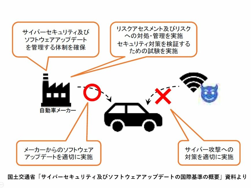また、上記を記載した書面の補足資料には、「特定改造等の許可制度」についても、UN-R155導入に伴う改正事項の記載が含まれている。国土交通省の解説によれば、同許可制度は、昨今の自動車技術の進展に伴い、自動車製作者などが通信を活用して使用過程時の自動車の電子制御装置に組み込まれたプログラムを改変し、性能変更や機能追加(改造)を大規模かつ容易に行うことが可能になったことを背景に、サイバーセキュリティーの確保を含め、改造が適切に行われることを確保するために、19年5月の改正道路運送車両法に基づき導入された制度だという。同制度の許可基準として、UN-R155に規定されるサイバーセキュリティーを確保するための業務管理システム要件適合が追加されたほか、所要の改正が行われ、21年1月22日に施行されている。