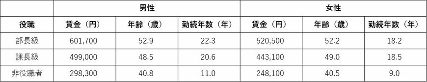 すると、「非役職者」が男性:29万8300円・女性:24万8100円、「課長級」が男性:49万9000円・女性:44万3100円、「部長級」が男性:60万1700円・女性:52万500円となっています(図表1参照)。