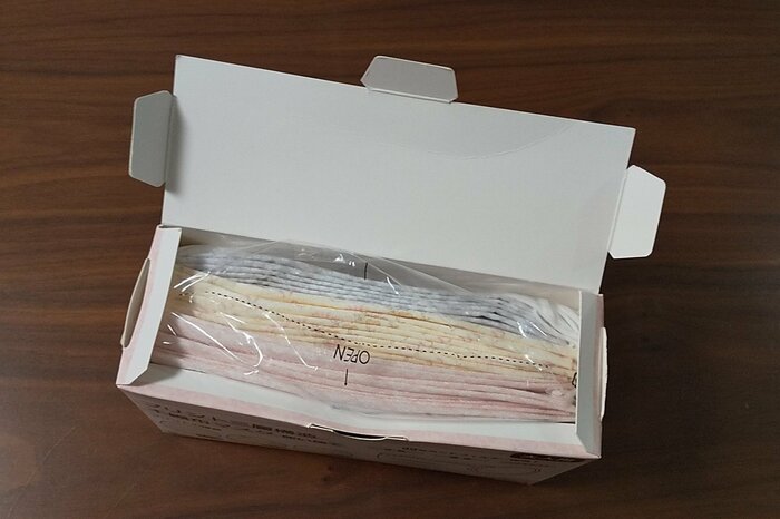 性能も3層構造でノーズワイヤー入り、耳の痛くなりにくい柔らかゴムを採用するなど、安心の設計となっています。今回は箱の形状が変わり、上部から好きな柄が簡単に取り出しやすく変更されたのもうれしいポイントです。