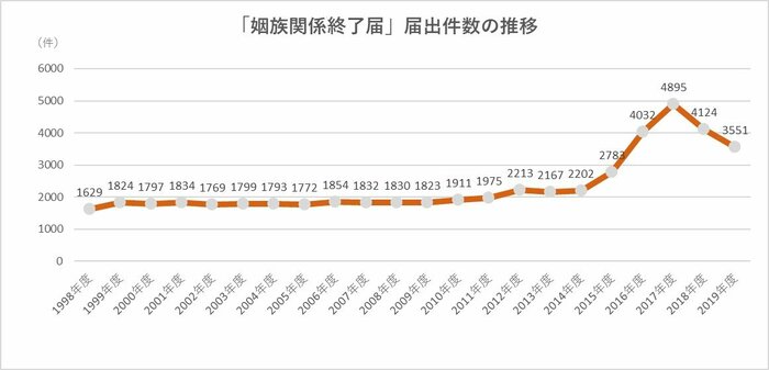 ここからは、法務省の「戸籍統計 統計表」から姻族関係終了届の届け出件数の推移を見ていきます。