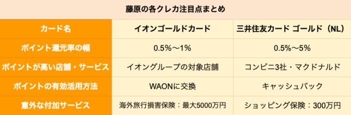 最後に、私の視点から今回ご紹介したクレジットカードの注目点をポイント還元率や有効活用方法、意外な付加サービスをまとめています。少しでもクレジットカード選びの参考になれば幸いです。