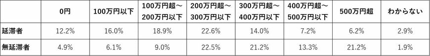 逆に「500万円超」は延滞者で6.2%、無延滞者は21.2%という結果で、前出の雇用形態がそのまま年収にも反映されていると見られます(図表2参照)。