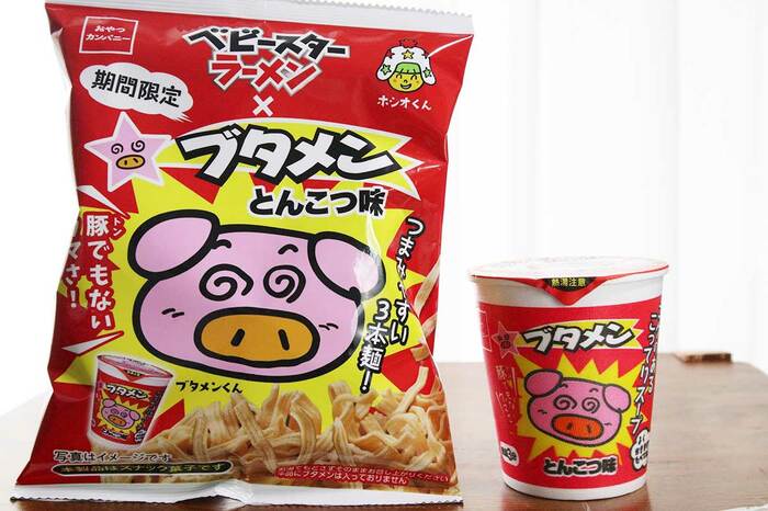 こちらは菓子メーカーのおやつカンパニーが展開する、みんな大好き『ベビースターラーメン』と、これまたみんな大好き『ブタメン』のコラボ商品。7月12日から期間限定商品として、東日本エリアで発売中とのこと。