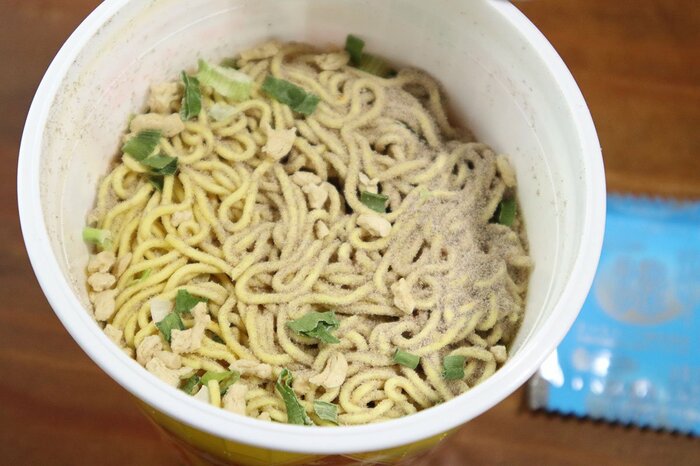 めんの量も80gの大盛り仕様(当社比)とのことで、持ってみるとずっしりとした存在感を感じますね。