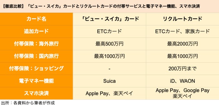 【徹底比較】「ビュー・スイカ」カードとリクルートカードの付帯サービスと電子マネー機能、スマホ決済