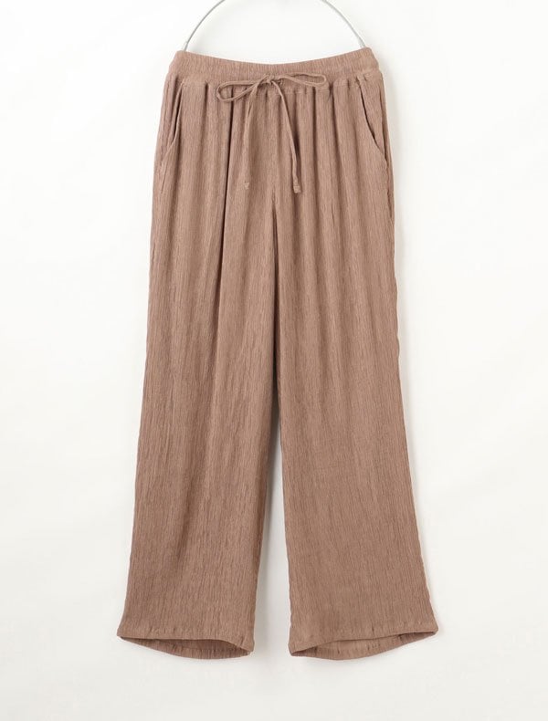 さらっとした楊柳生地のストレートパンツ。軽やかな着ごこちとウエストゴムで、ストレスなく履けるそうです。表面に施された縦ジワにより、着痩せも叶えてくれます。全体的にゆったりとした、リラックス感のあるつくりも魅力です。あえてオーバーサイズのTシャツを合わせて、メンズライクに着こなしてもおしゃれ。