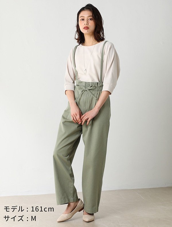 フロントの大きいリボンがかわいらしいデニム。締めつけのないストレートパンツは、ウエストの後ろ部分にゴムが入っているので、長時間の着用も楽ちんです。取り外しができるサスペンダーもつき、気分によって着こなしの変化を楽しめます。