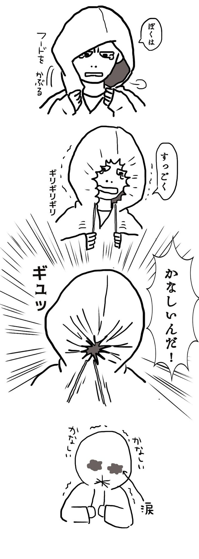 「かなしいんだ!」という心からの叫びと共に、ギュー―っとコードを引っ張ると、完全に顔が隠れて…!ジワーッとフードに涙がにじむのでした。