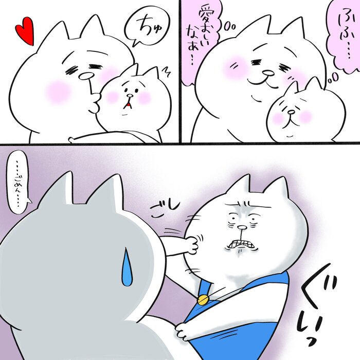 「ふふ…愛おしいなあ…」あまりの愛らしさに、ほっぺたにチューしたところ、ここで長男さんの反応が急変…?思わずプクティさんも、「…ごめん…」とつぶやくのでした。