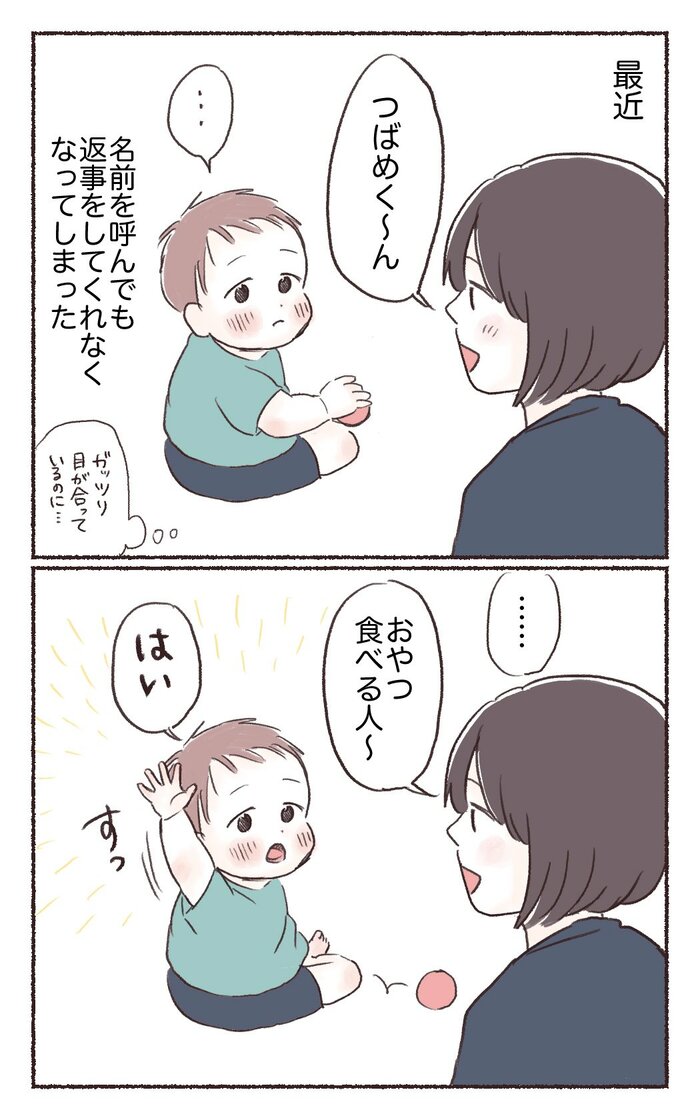 最近、名前を呼んでも返事をしてくれなくなってしまったという息子さん。「つばめく~ん」と目を合わせながら呼びかけても、「…」と反応はなしです。ところが、「おやつ食べる人~」と呼びかけると、「はい」よいお返事で手を挙げます。どういうことなんでしょう?