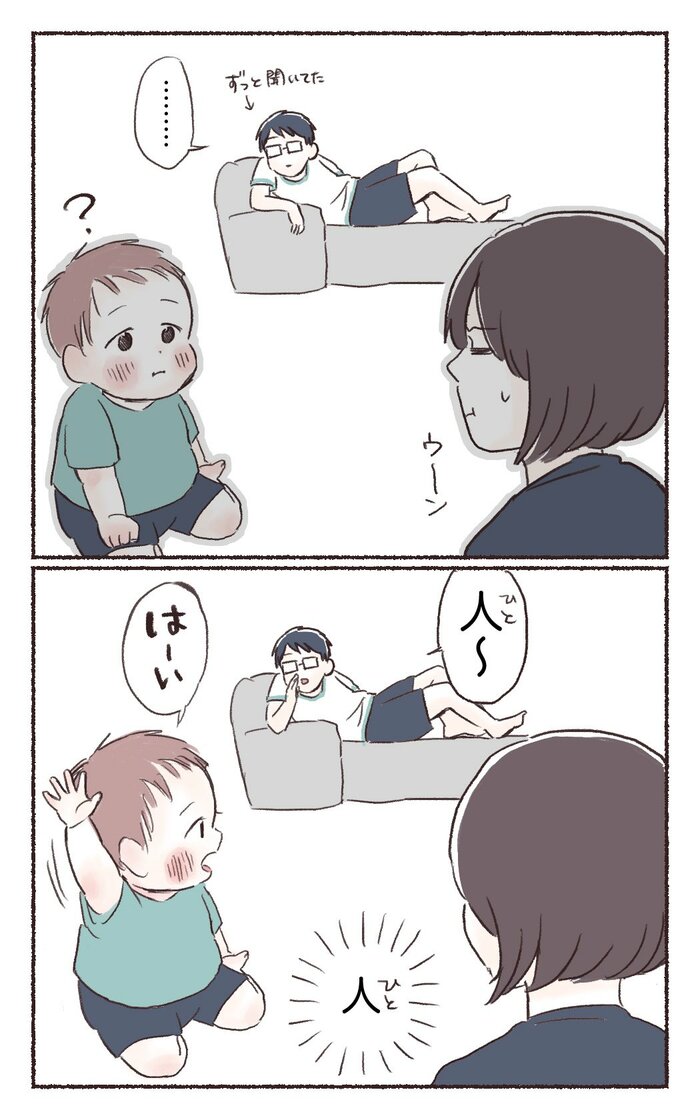 さて、このやり取りをずっと聞いていた旦那さん。ある法則を見つけたようで、「人~」と息子さんに呼びかけます。そのお返事は…?