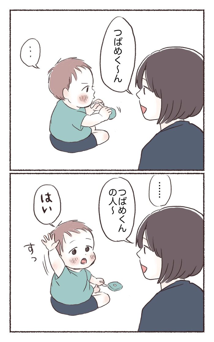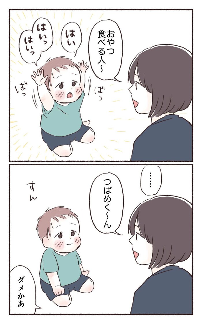 ふと思い立ったえぴこさん。「つばめくんの人~」と呼びかけると、「はい」のお返事。「おやつ食べる人~」には「はい、はいっ、はいっ」と元気いっぱいです。ところがやっぱり、「つばめく~ん」と呼びかけると…。「ダメかあ」。