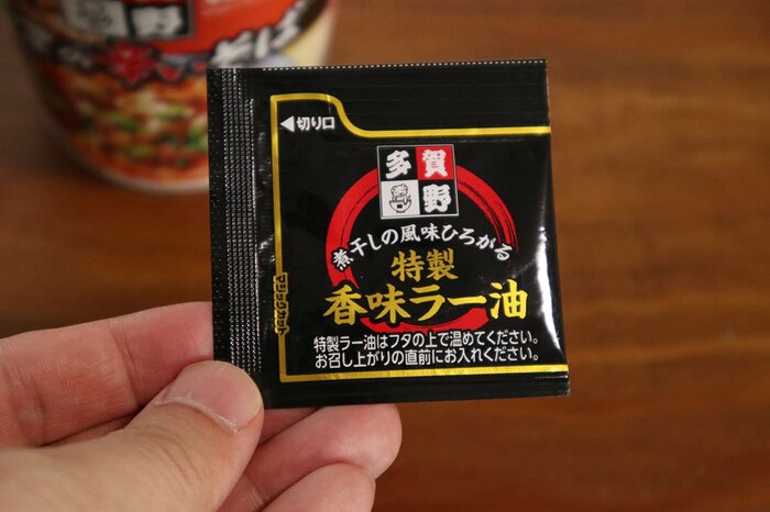 別添の調味料は香味ラー油のみで、蓋上で温めるタイプです。別添のかやくはありません。フタを開けてみると、ミンチ肉、ネギ、赤唐辛子の姿が。他にもごま、玉ねぎなどが入っているそうです。