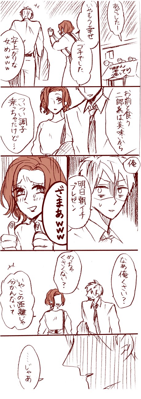 食べ終わり、帰路につく二人。楽しそうに会話が弾みます。「いやもう幸せ ゴチでした」「安上がりな女めwww」と憎まれ口を叩きますが、とはいえ男性はまんざらでもないようで、「お前と食う二郎系はうまいから、ついつい調子乗っちゃったけど、俺 明日朝イチプレゼン」「ざまあwww」。