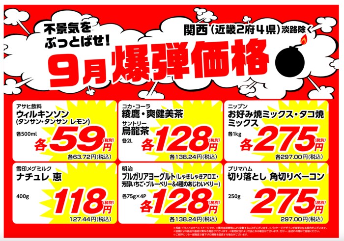 関西エリアでは、お好み焼きミックス・タコ焼ミックス(各1kg)275円や、切り落とし 角切りベーコン(250g)275円など、爆弾価格の商品がランナップ。