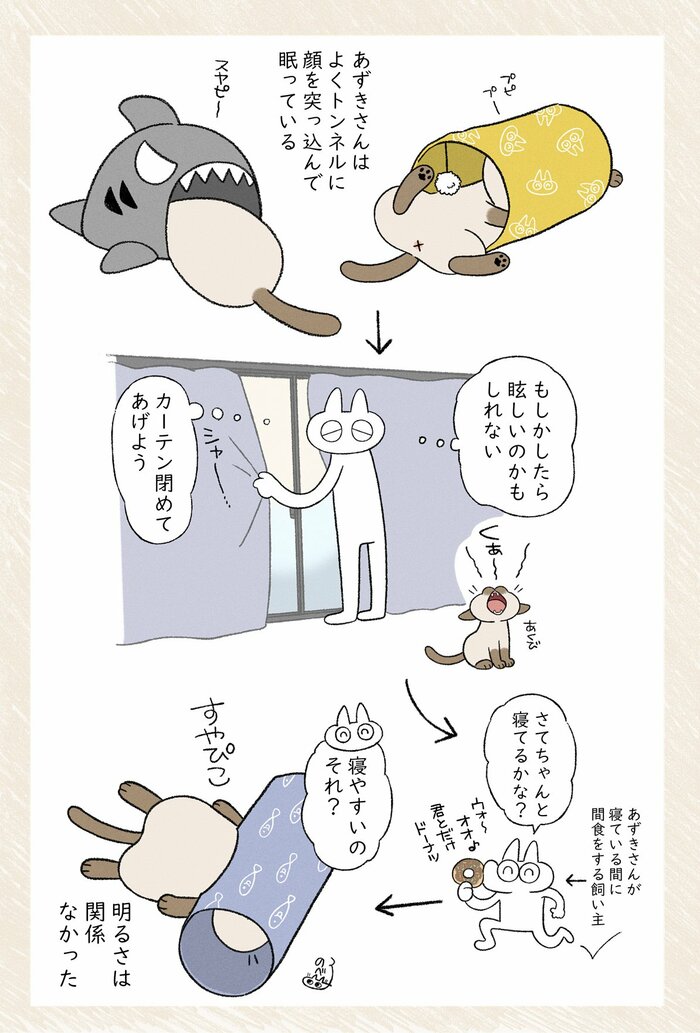 普段から、トンネル状の家具やぬいぐるみに頭を突っ込んで寝ているというあずきさん。「もしかしたら眩しいのかもしれない」「カーテン閉めてあげよう」。のべ子さん、眠たそうにあくびをするあずきさんを見ながら、カーテンを閉めてあげました。