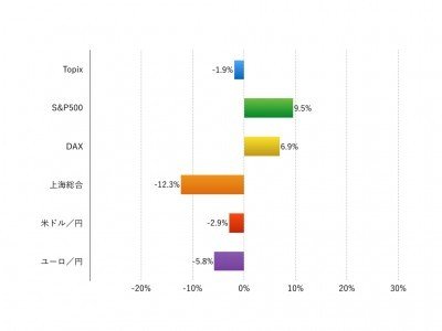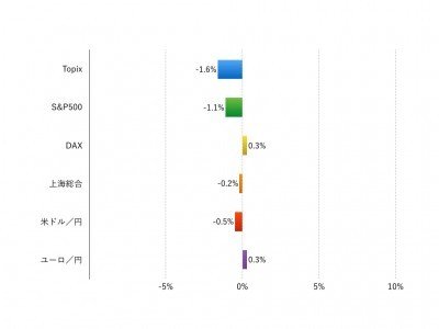 先週(12月26日‐12月30日)の世界の株式市場は、日米株が下落し、欧州株と上海株は小動きでした。週間騰落率は現地通貨ベースでTOPIXが▲1.6%、米S&P500が▲1.1%、独DAXが+0.3%、上海総合が▲0.2%です。一方、先々週軟調だった新興国株は一斉に反発しました。