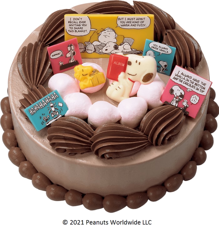 スヌーピーのNEWアイスクリームケーキも登場します!スヌーピーとウッドストックがアルバムを見ながら楽しいできごとを思い出しているシーンをイメージ。クッキー入りキャラメルリボンとチョップドチョコレートのフレーバーをチョコホイップでデコレーション。スヌーピーとウッドストック、思い出のシーンはチョコプレート。みんなで一緒に楽しくおいしい時間を作っちゃいましょう。