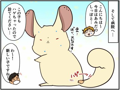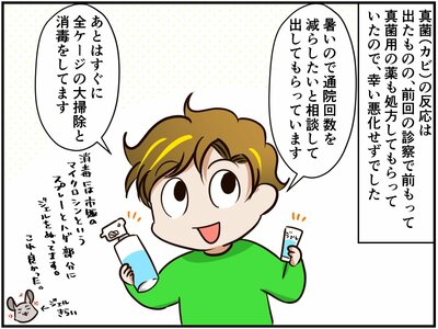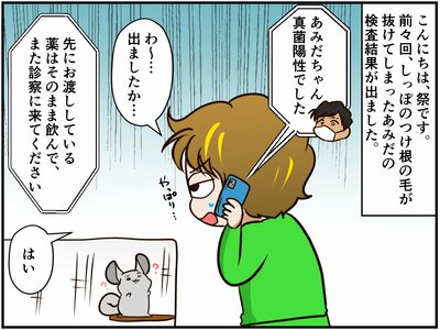 しっぽの付け根に抜け毛が見つかり、病院で診察を受けたあみだちゃん。検査結果が出て、原因は真菌(カビ)と判明。祭さんは、あみだちゃんと、同じ症状が出始めた福くんの2匹を連れて再び病院を訪れます。