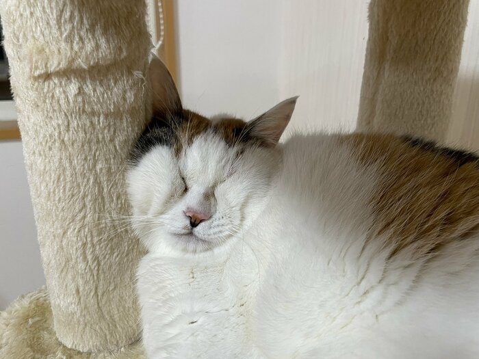 「あまりにも…あまりにもギュッとしていて見つけたとき爆笑してしまいました」というコメントとともに掲載された写真は、三毛猫の女の子・ミケさんがキャットタワーに顔をギュー―っと押し付けて眠る様子。