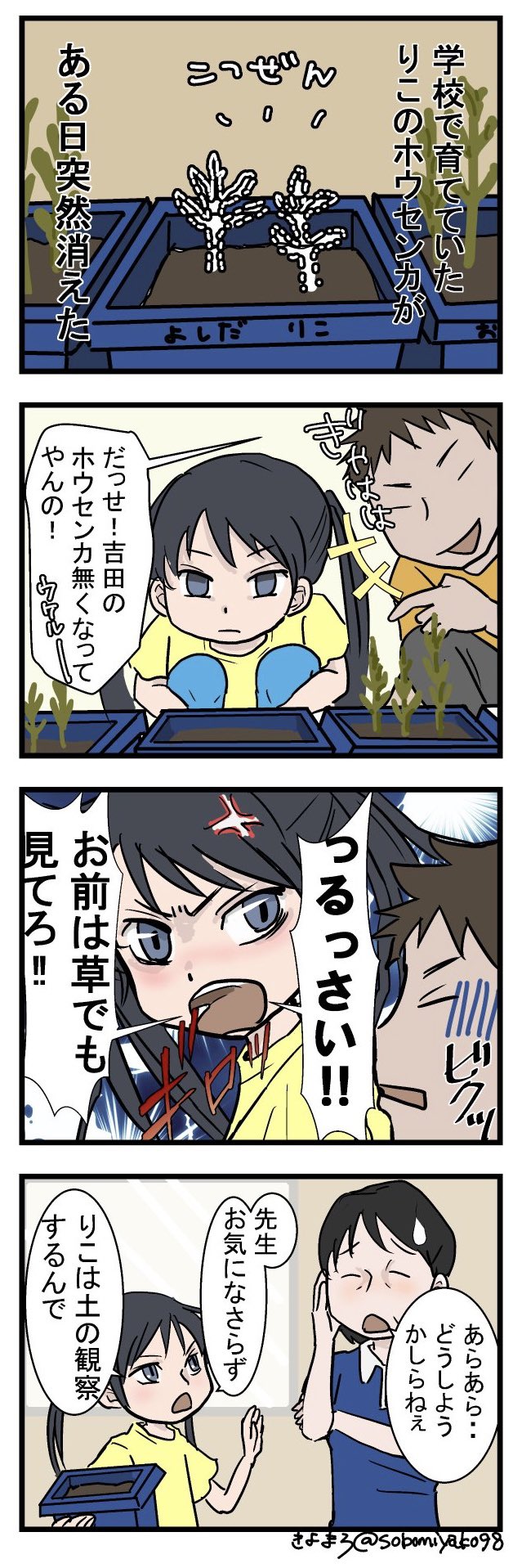 小学生の娘が学校で育てていたホウセンカ。ある日突然、消えてしまって…。なぜ?犯人は?漫画家・きよまろさん(@sobomiyako98)がツイッターに投稿した漫画に反響が寄せられていました。