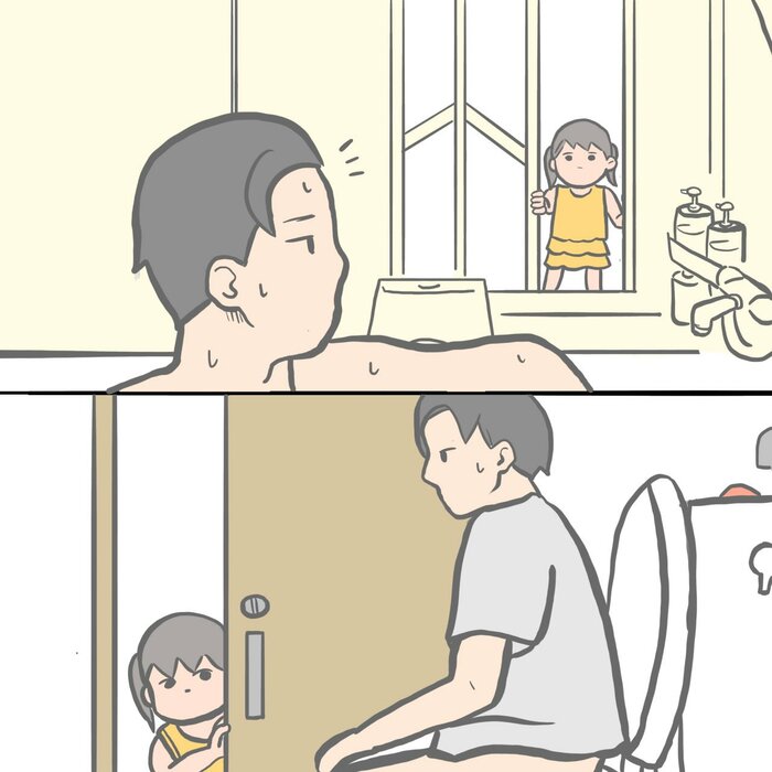 『まなざし』と題されたこちらの漫画。3歳の娘さんは、いつもゆーぱぱさんのことを見つめています。お風呂でも、トイレでも、車の中で大きなあくびをしているときも、お家でお仕事中であっても…。ふと気付くと、ゆーぱぱさんを見つめる“まなざし”があるのでした。