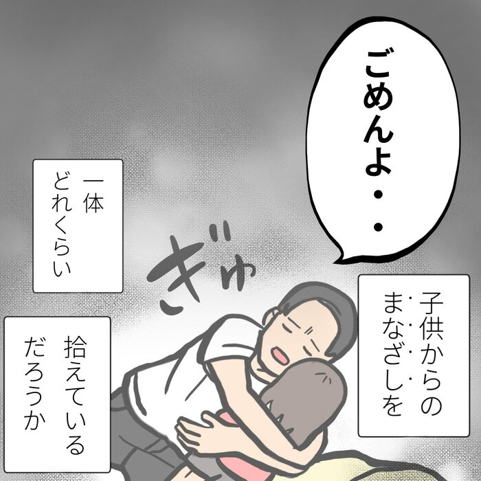 お子さんの健気な行動に、罪悪感を感じたゆーぱぱさん。抱きしめながら「ごめんよ…」と一言。「子供からのまなざしを 一体どれくらい 拾えているだろうか」。子供の視線に気付いてあげることの大切さを、改めて感じるゆーぱぱさんなのでした。