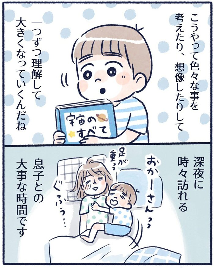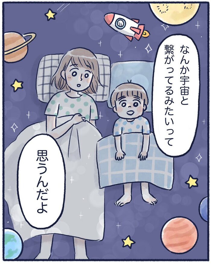 「だって夜って黒くてね… なんか宇宙と繋がってるみたいって思うんだよ」。まだまだ拙い言葉を組み合わせて、自分なりに想像力豊かな世界と宇宙の繋がりを表現したとっくん。