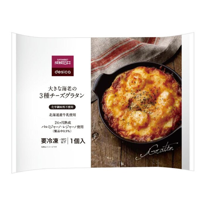 成城石井オリジナルブランド「desica」の冷凍食品は、本格的でおいしいとSNSでも大評判。中でも「大きな海老の3種チーズグラタン」は、こだわりの3種チーズ、さらに大きな海老が4つものった贅沢な一品です。チーズは24ヶ月熟成パルミジャーノ・レジャーノ、ゴーダ、モッツァレラという3種。コクのある北海道産牛乳を使ったベシャメルソースにチーズの旨味が加わり、食べごたえのあるペンネグラタンに絡みます。クリーミーで濃厚な味わいなのに化学調味料は不使用。ファンたちからもリピ買い指名される名品です。