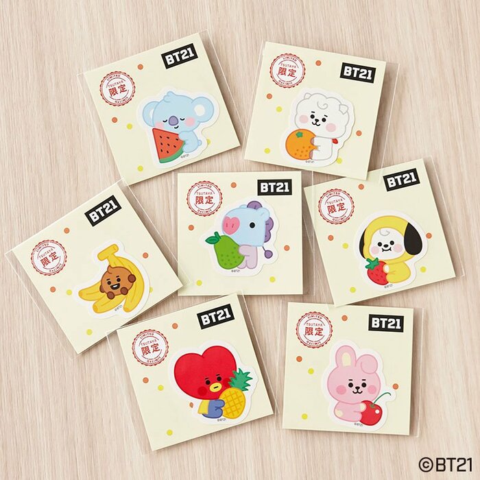 2021年9月3(金)より、ツタヤではフルーツをモチーフにした「BT21」オリジナル書き起こしデザイン・TSUTAYAオリジナル商品の販売をスタートしました。グッズは、A4サイズのクリアファイルや、口元・目元のチェックに便利なスティックミラー、メモやステッカー、マスキングテープ、ぬいぐるみキーホルダーといった身近にあるとワクワクする商品が勢ぞろいしています。