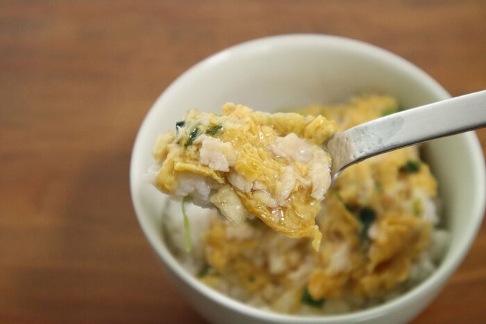 食べてみますと、見事に親子丼ですね…。鶏のサイズ感が細切りなのが悔やまれますが、まあでもね、フリーズドライ製法で30秒で作れる究極のお手軽・親子丼、鶏肉の形にまでとやかくいうのは野暮というものかもしれません。それ以外は完全にしっかり親子丼で度肝をぬかれました。美味しいです。