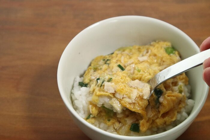 筆者はたまたま自宅にあった冷凍ご飯で作ったので、ご飯量は140g。食べる前は、具材の量に対してちょっと多いかな?と思いましたが、具材の汁っけもあるのでけっこう大丈夫でした。つゆだく感をしっかり味わいたい場合は100g~120gぐらいだといいかもしれません。