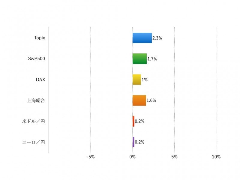 先週(1月2日‐1月6日)の世界の株式市場はほぼ全面高でした。週間騰落率は現地通貨ベースでTOPIXが+2.3%、米S&P500が+1.7%、独DAXが+1.0%、上海総合が+1.6%です。2016年最終週は日米株が下落し、新興国株が上昇ましたが、年初の相場はトルコ市場を除き全面高だったと言えます。