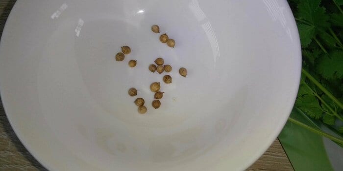 パクチーの種はまりのような球形。種まき前に種を少し潰し、一晩給水させておくと、発芽しやすくなります。土はうすくかけるくらいで大丈夫です。